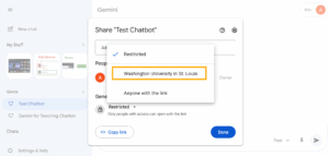 - Once you have created your Gem, you should be provided with a prompt to share. Sharing the link is how you give access to students. Note: be sure to update general access to Washington University in St. Louis or Anyone with the link so that your students can access the chatbot.