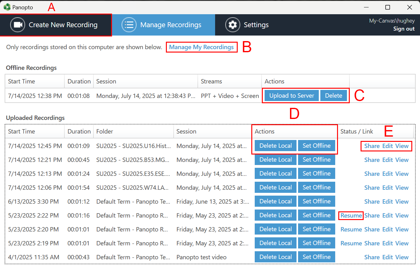 - B: “Manage My Recordings” will take you to the Panopto web interface [LINK TUTORIAL].