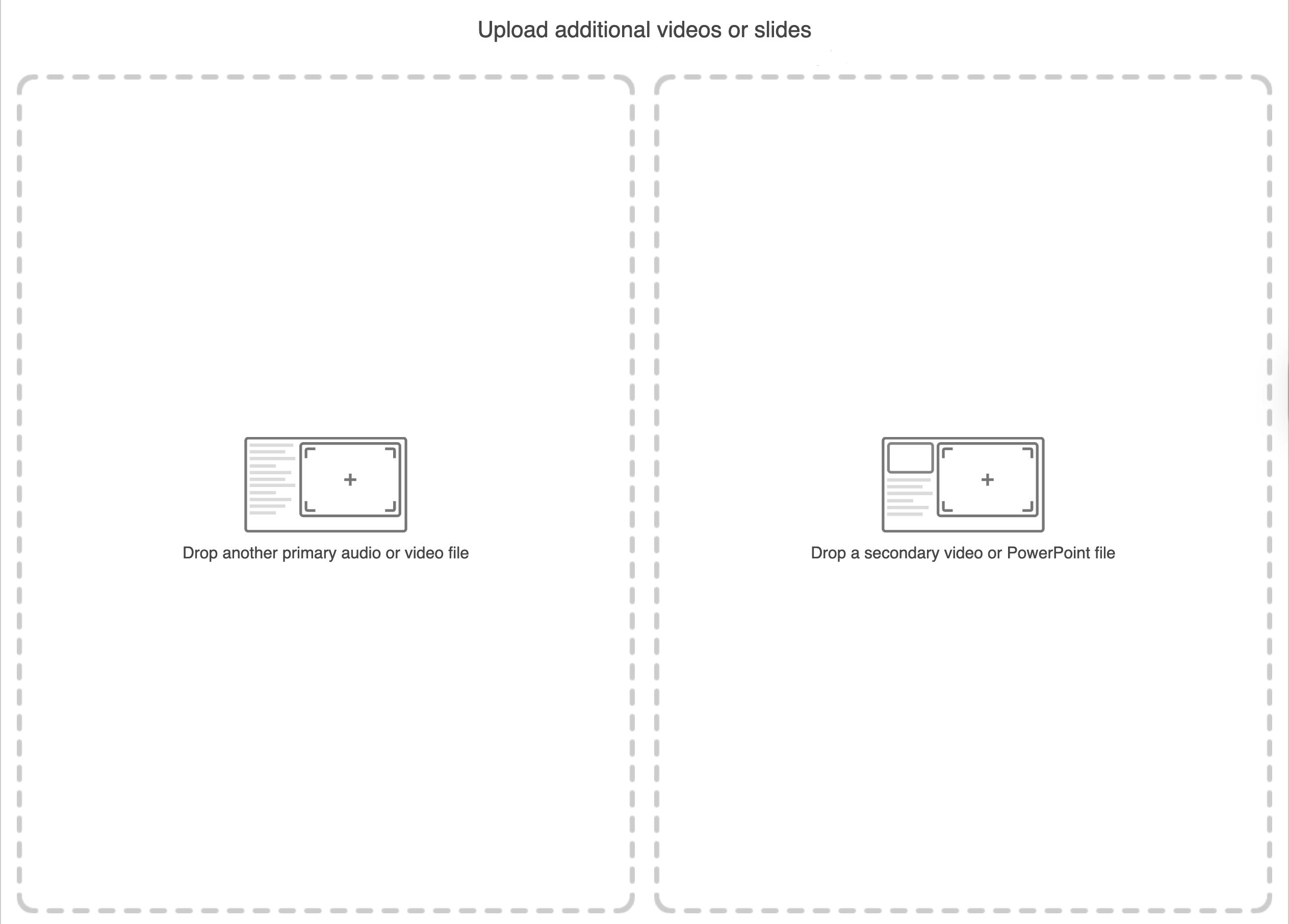 - Once you have added a primary video, you will be given the option to Drop another primary audio, video, or other file on the left side or Drop a secondary video or PowerPoint file on the right side: