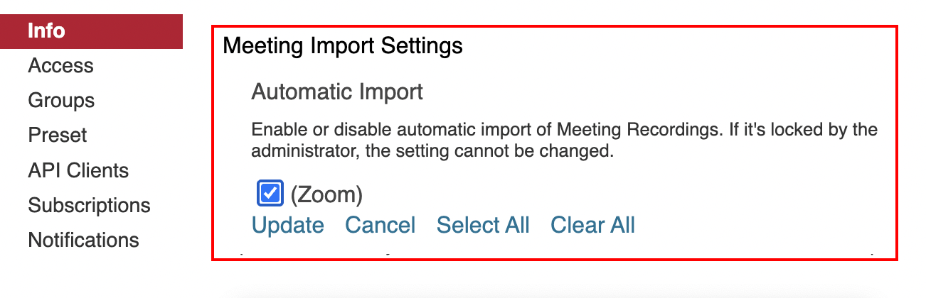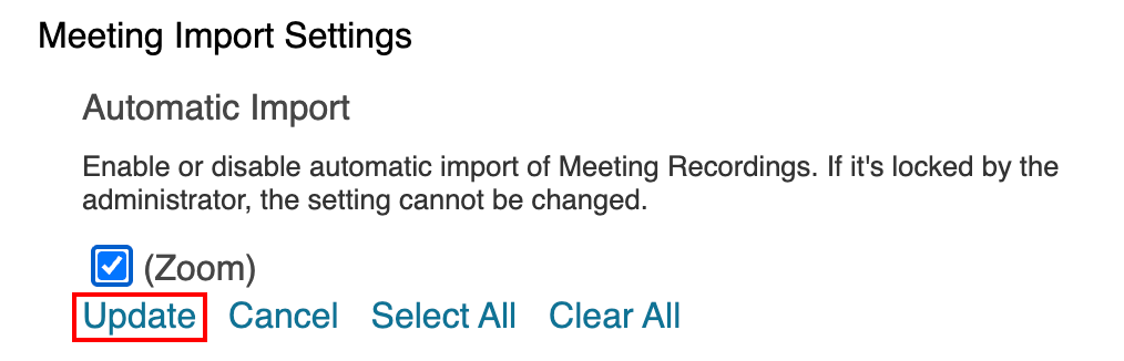 NOTE: When you choose automatic import from Zoom, all Zoom video recordings will automatically transfer over to Panopto for long term storage. Your Zoom recordings will not immediately delete from your Zoom account. With that said, Zoom recordings are regularly deleted after a period of time. So if you do want to save your Zoom recordings, automatically importing them into Panopto is a great way to do this.